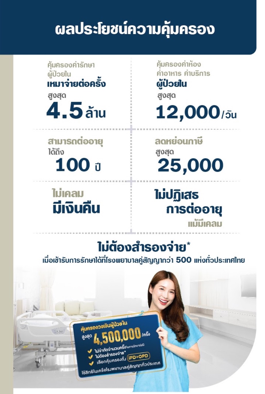 เหนือระดับด้วยการรักษากับโรงพยาบาลชั้นนำใเครือBDMS, เกษมราษฎร์และโรงพยาบาลอีกกว่า 500 แห่งโดยไม่ต้องสำรองจ่าย | เคลมเยอะแค่ไหนก็ไม่หวั่น ไม่ปฎิเสธการต่ออายุ แม้มีเคลมสูง |