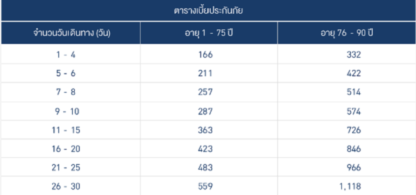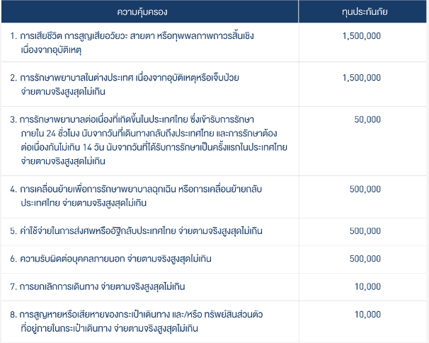 | หมายเหตุ 1. รายละเอียดของความคุ้มครอง เงื่อนไข และข้อยกเว้นจะระบุไว้ในกรมธรรม์ประกันภัย 2. การเรียกร้องค่าสินไหมทดแทนค่ารักษาพยาบาลในต่างประเทศ ผู้เอาประกันภัยจะต้องสำรองเงินจ่ายล่วงหน้า โดยสามารถนำใบเสร็จรับเงินและใบรับรองแพทย์ ฉบับภาษาอังกฤษ มาดำเนินการเรียกร้องค่าสินไหมทดแทนได้ที่บริษัทฯ ทั้งนี้ บริษัทฯ จะจ่ายเป็นสกุลเงินบาท โดยจะเทียบตามอัตราแลกเปลี่ยน ณ วันที่ ผู้เอาประกันภัยเข้ารับการรักษาพยาบาล | |