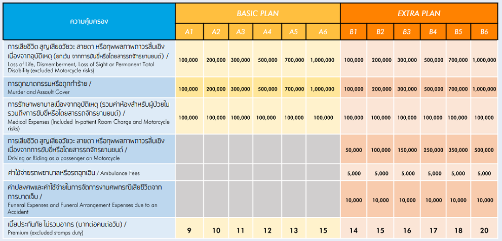 เบี้ยประกันภัยหลักสิบ ได้รับความคุ้มครองหลักล้าน เบี้ยประกันภัยถูกสุด เริ่มต้นเพียง 9 บาท ต่อคนต่อวัน* ปรับความคุ้มครองที่สูงขึ้น เพิ่มเบี้ยเพียง 5 บำท ต่อคนต่อวัน รับประกันภัยได้ทุกอาชีพ ทุกเพศ ทุกวัย ตั้งแต่อายุ 1 เดือน -75 ปี คุ้มครองครอบคลุมกำรขับขี่หรือโดยสำร รถจักรยานยนต์ คุ้มครองกำรถูกฆาตกรรมหรือถูกทำร้ายรับไฟล์กรมธรรม์ทางอีเมล์ง่ำยๆภายใน 30 นาที | |||
