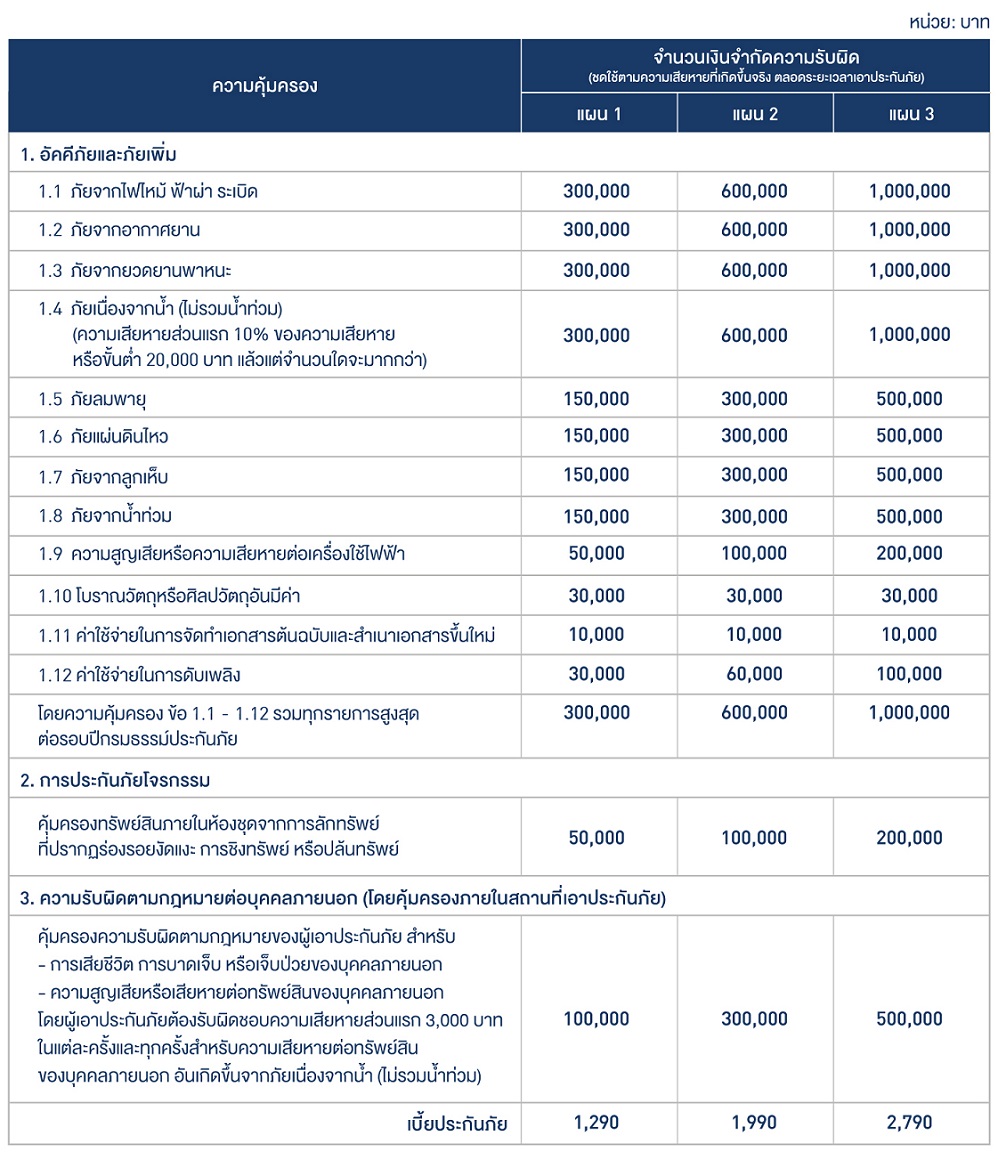 มอบความอุ่นใจให้แก่ผู้พักอาศัยคอนโด ด้วยความคุ้มครองเฉพาะทรัพย์สินภายในคอนโดของผู้เอาประกันภัย ที่อาจได้รับความเสียหายต่างๆ ทั้งจากอัคคีภัย น้ำรั่วไหล น้ำท่วม ลมพายุ แผ่นดินไหว ความเสียหายจากการถูกโจรกรรม รวมถึง ความรับผิดตามกฎหมายต่อบุคคลภายนอก |  |  | ทรัพย์สินภายในคอนโดที่ให้ความคุ้มครอง เฟอร์นิเจอร์เครื่องมือ เครื่องใช้ เครื่องใช้ไฟฟ้า อุปกรณ์ไฟฟ้า เครื่องดนตรี เครื่องเสียง และทรัพย์สินอื่นๆ เพื่อการอยู่อาศัย รวมถึงเครื่องตกแต่ง สิ่งติดตั้งตรึงตราภายในคอนโดของผู้เอาประกันภัยหรือสมาชิกในครอบครัว หรือทรัพย์สินที่ผู้เอาประกันภัยต้องรับผิดชอบตามกฎหมาย |