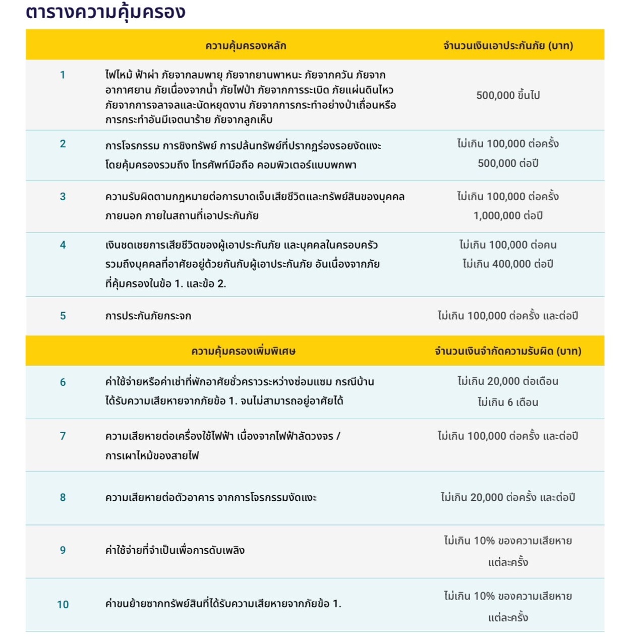 | แผนการประกันภัยนี้ไม่ค้มครอง 1. สิงปลูกสร้างที่เป็นไม้ ครึ่งตึกครึ่งไม้ ทรัพย์สินที่ตั้งอยู่ในเขตบล๊อกอันตราย หรืออยู่ในชุมชนแออัด 2. ทรัพย์สินประเภท ธนบัตร พันธบัตร ทองแท่ง เอกสาร แบบแปลน แผนผัง ภาพเขียน หลักทรัพย์ แบบพิมพ์ หรือแม่พิมพ์ อากรแสตมป์ เป็นต้น 3. เครื่องแก้ว เครื่องกระเบื้อง เครื่องเคลือบดินเผา หินอ่อน หรือวัตถุอื่นที่เปราะหรือแตกง่าย 4. วัตถุระเบิด ยานพาหนะทุกชนิด ไม่ว่าจะเป็นทางบก ทางนํ้า หรือ ทางอากาศ 5. ความเสียหายเนื่องจากภัยก่อการร้าย การก่อวินาศกรรม 6. การยกเว้นความคุ้มครองสําหรับข้อมูลอิเล็กทรอนิกส์และอินเตอร์เน็ต |