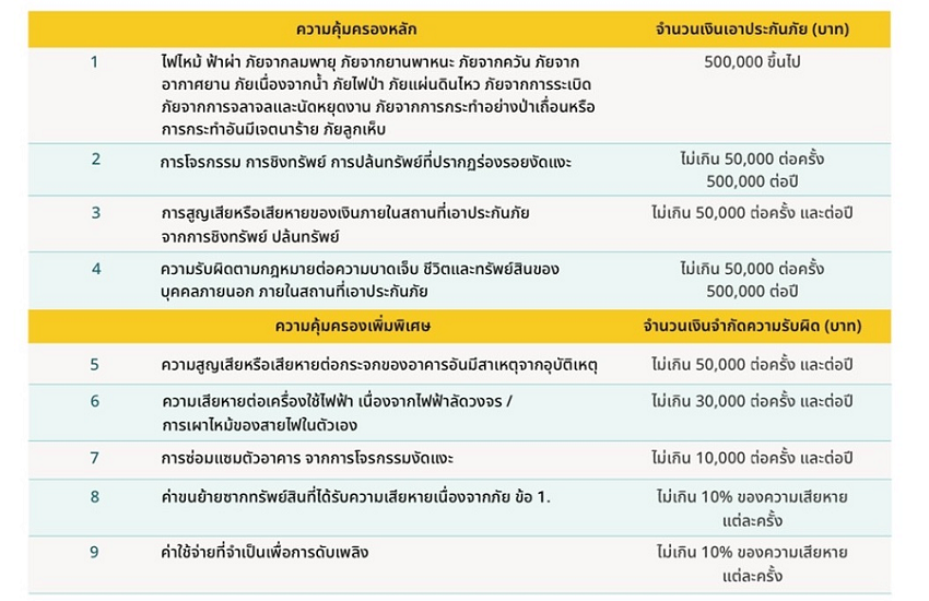 | แผนการประกันภัยนี้ไม่ค้มครอง 1. สิ่งปลูกสร้างที่เป็นไม้ ครึ่งตึกครึ่งไม้ ทรัพย์สินที่ตังอยู่ในเขตบล๊อกอันตราย หรืออยู่ในชุมชนแออัด