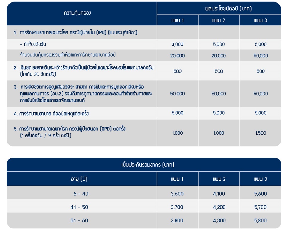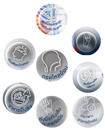 | 4. คุ้มครอง 8 โรค ดังต่อไปนี้ 4.1 อาหารเป็นพิษจากภาวะติดเชื้อในระบบทางเดินอาหาร 4.2 การติดเชื้อในระบบทางเดินปัสสาวะ 4.3 โรคกรดไหลย้อน 4.4 โรคกระเพาะอาหารอักเสบ 4.5 โรคหมอนรองกระดูกเคลื่อนกดทับเส้นประสาท 4.6 อาการวิงเวียนศรีษะบ้านหมุน 4.7 โรคกดทับเส้นประสาทบริเวณข้อมือหรือพังพืดกดทับเส้นประสาท 4.8 โรคนิ้วล็อก ปลอกหุ้มเอ็นนิ้วมืออักเสบ |  |