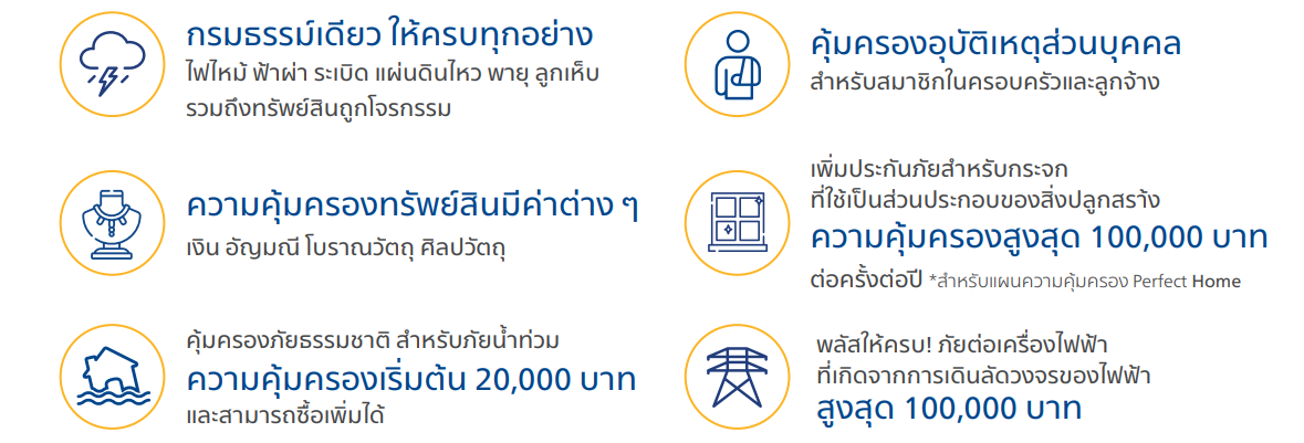 | รายละเอียดความคุ้มครอง 1.ความคุ้มครองหลัก: บ้าน/สิ่งปลูกสร้าง และทรัพย์สินภายใน คุ้มครองความสูญเสียหรือเสียหายต่อ สิ่งปลูกสร้าง (รวมฐานราก) และ ทรัพย์สินภายในบ้าน เช่น เฟอร์นิเจอร์ ของใช้ เครื่องครัว ฯลฯ จากเหตุสำคัญ เช่น