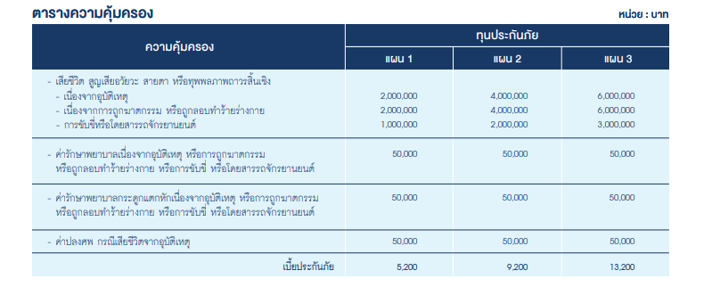 | การประกันภัยอุบัติเหตุส่วนบุคคล ยกระดับความคุมครองที่คุ้มค่ามากยิ่งขึ้น ด้วยทุนประกันภัยที่ให้มากกว่าเดิม กรณีเสียชีวิต สูญเสียอวัยวะ ทุพพลภาพถาวรสิ้นเชิง เนื่องจากอุบัติเหตุ การถูกฆาตกรรมหรือถูกลอบทำร้ายร่างกาย และการขับขี่หรือโดยสารรถจักรยานยนต์ ครอบคลุมถึงค่ารักษาพยาบาลทั่วไป และค่ารักษาพยาบาลกระดูกแตกหัก สูงสุด 50,000 บาท |