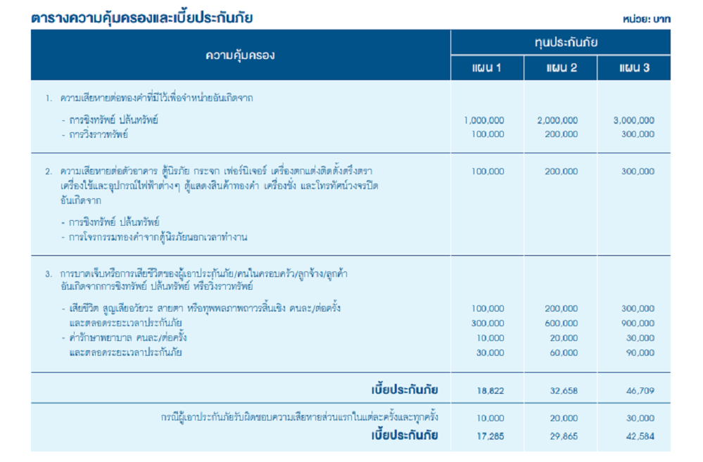 | หลักประกันที่มั่นคง ให้คุณประกอบธุรกิจร้านทองด้วยความอุ่นใจ คุ้มครองทั้งคุณและทรัพย์สินจากการถูกชิงทรัพย์ ปล้นทรัพย วิ่งราวทรัพย์ พร้อมค่ารักษาพยาบาล เบี้ยประกันภัยเริ่มต้นเพียง 52 บาท/วัน คุ้มครองสูงสุดถึง 3,000,000 บาท คุ้มยิ่งขึ้น ด้วยส่วนลดพิเศษสูงสุด 20% เมื่อมีมาตรการรักษาความปลอดภัยครบทั้ง 4 ข้อ